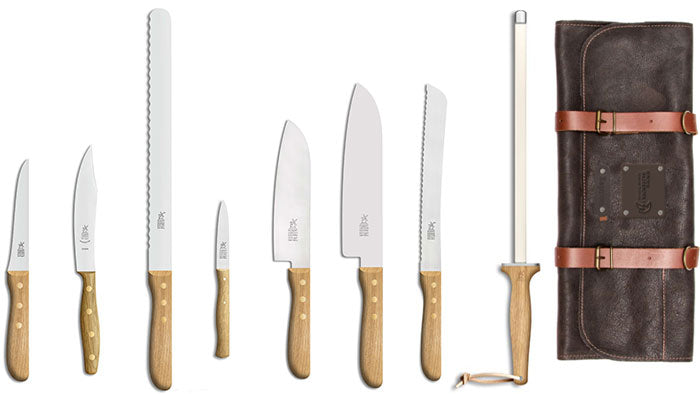 De originele set inclusief aanzetstaaf in de speciaal voor ons ontworpen messenrol.