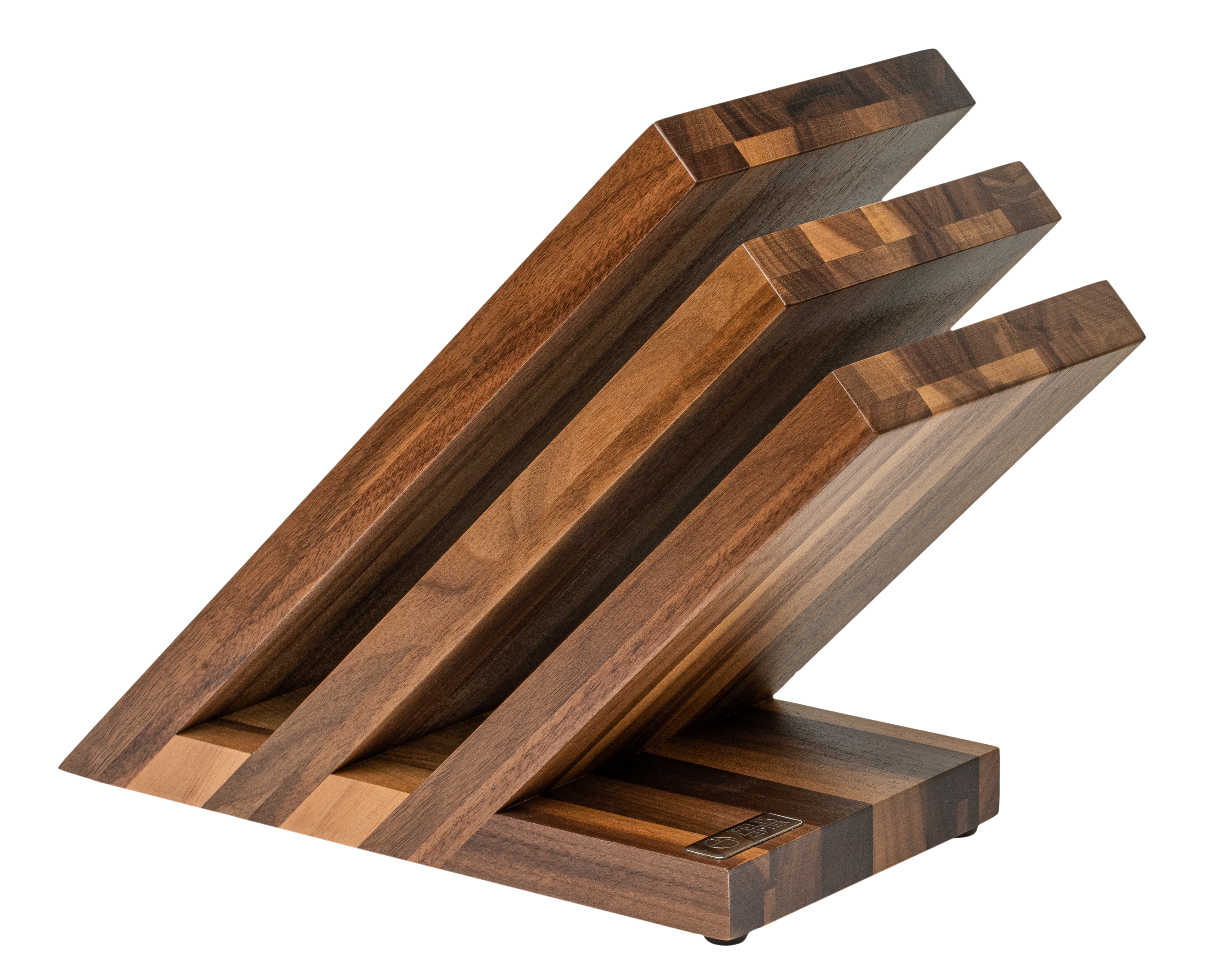 Het magnetische messenblok in waaierdesign, bestaande uit hoogwaardig walnoothout, biedt ruimte voor maximaal 10 messen. Door de vormgeving van het blok is het bijzonder ruimtebesparend en daardoor ideaal voor zelfs de kleinste keuken of werkblad. De maximale lemmetlengte mag ongeveer 29 cm zijn