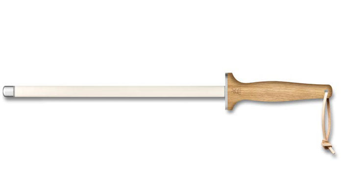 De corundin is een keramische staaf met een korrel van 1500, dit betekent dat je de snede op het lemmet licht slijpt of polijst terwijl je aanzet. Ik heb geleerd aan te zetten op een aanzetstaal, daarmee zet je de V-vorm van het snijvlak weer netjes. Alleen leerde ik uit de praktijk dat keramische staven effectiever zijn, met name voor carbonstalen messen. Keramische aanzetters polijsten namelijk ook kleine braampjes en oneffenheden uit de snede. Het bijzondere van deze lange aanzetter is dat het keramiek vervangen kan worden. Keramische staven kunnen namelijk wel eens breken. Er zit een schroefdop op de top, waarmee je de keramische buis kan vervangen om de stalen middenstaaf.