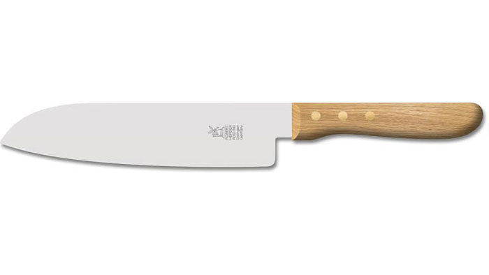 De grote santoku is een echte slicer en chopper voor het zware werk. Je kunt er net zo goed een mooi groot stuk vlees mee aansnijden als kruiden mee hakken of ui mee snipperen. Door de balans iets meer naar de punt te leggen, blijft het mes perfect in de hand liggen bij het ‘ciseleren’, waarbij het mes recht op en neer beweegt.