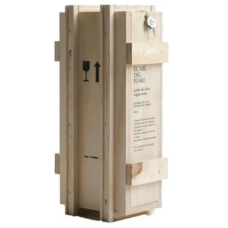 Elke fles wordt omhuld in het traditionele gaas dat wordt gebruikt om de olijven op te vangen bij het plukken, waarna de fles verpakt wordt in een met de hand gemaakt houten kratje en verzegeld om de uniekheid van iedere fles te garanderen.