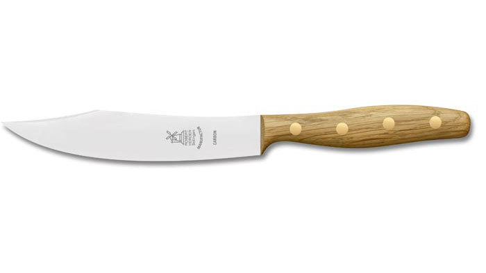 Als je het nog niet opgevallen was, ik hang erg aan traditie en kwaliteit. Ik denk daarnaast dat het niet altijd nodig is om het wiel opnieuw uit te vinden. Bij het zoeken naar een handzaam vleesmes in het assortiment van Robert Herder, liep ik tegen de Hechtsabels aan, een mes met een traditie van meer dan 100 jaar. Geschikt voor vlees, worst en mooi genoeg voor op tafel. Alleen kon het zwaar werk aan? Het uitbenen en portioneren van gevogelte en wild was mijn doel. Na een aantal prototypes besloten we om het mes een kesselschliff te geven of stabil te maken. Daarnaast is het handvat iets doorgetrokken om een vingerbescherming of 'krop' te maken. Ook met dit mes hebben we een jaar proefgedraaid, vele kippen zijn ermee opgedeeld, uitgeklapt en uitgeserveerd. We hebben er wilde en tamme eend mee schoongemaakt en er grote stukken vlees mee bijgesneden voor ze op de barbecue gingen. Dit mes was samen met het brisketmes, de aanleiding voor deze set en we zijn er apetrots op.