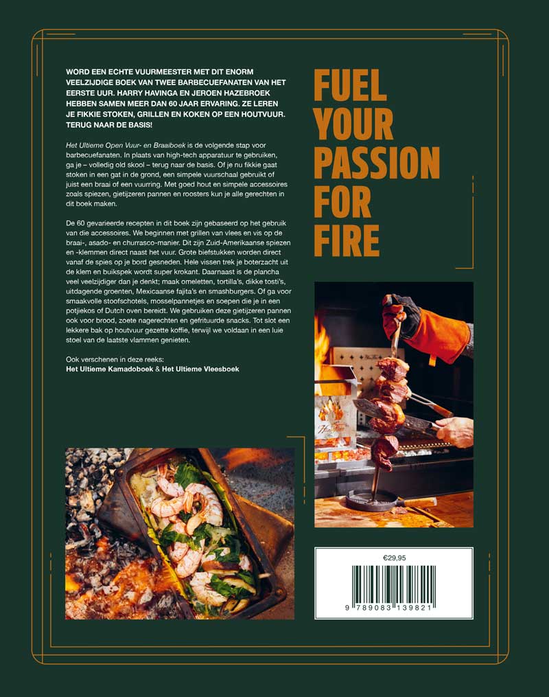 De 60 gevarieerde recepten in dit boek zijn gebaseerd op het gebruik van die accessoires. We beginnen met grillen van vlees en vis op de braai-, asado- en churrasco-manier. Dit zijn Zuid-Amerikaanse spiezen en -klemmen direct naast het vuur. Grote biefstukken worden direct vanaf de spies op je bord gesneden. Hele vissen trek je boterzacht uit de klem en buikspek wordt super krokant. Daarnaast is de plancha veel veelzijdiger dan je denkt; maak omeletten, tortilla’s, dikke tosti’s, uitdagende groenten, Mexicaanse fajita’s en smashburgers. Of ga voor smaakvolle stoofschotels, mosselpannetjes en soepen die je in een potjiekos of Dutch oven bereidt. We gebruiken deze gietijzeren pannen ook voor brood, zoete nagerechten en gefrituurde snacks. Tot slot een lekkere bak op houtvuur gezette koffie, terwijl we voldaan in een luie stoel van de laatste vlammen genieten